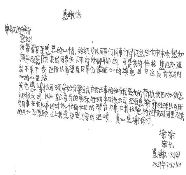 经过半个月治疗休养,刘军手部已无大碍。出院后的他写了一封感谢信并为公司送了一面锦旗,他说道,是熊猫体育-熊猫体育(中国)官方网站这个大家庭让他感受到了关怀和温暖,他表示要把这种关怀变成工作上的动力,争取早日返回工作岗位,努力工作,回报大家的关心和关爱。